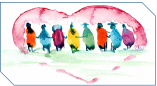 Deze aquarel voelt voor mij aan als een healing die heel diep gaat. De rauwe randjes zijn ervan af. Het zijn de laatste weeën. De kennis borrelt omhoog zo gauw de ander uit pijn stapt. Het delen is o zo belangrijk. Er is durf voor om over zelfkennis te beschikken. Hierdoor komen er talenten omhoog waarvan je niet wist dat je ze had. Je weet als geen ander waar je staat. Kwetsbaar durven te zijn bij de juiste personen. Hierdoor ontstaat veerkracht. Wederzijds begrip. Vriendschap voor het leven.